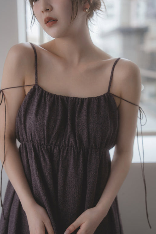 たっぷりと寄せた胸元のギャザーと、肩に垂れる華奢なリボンがデザインポイント。
